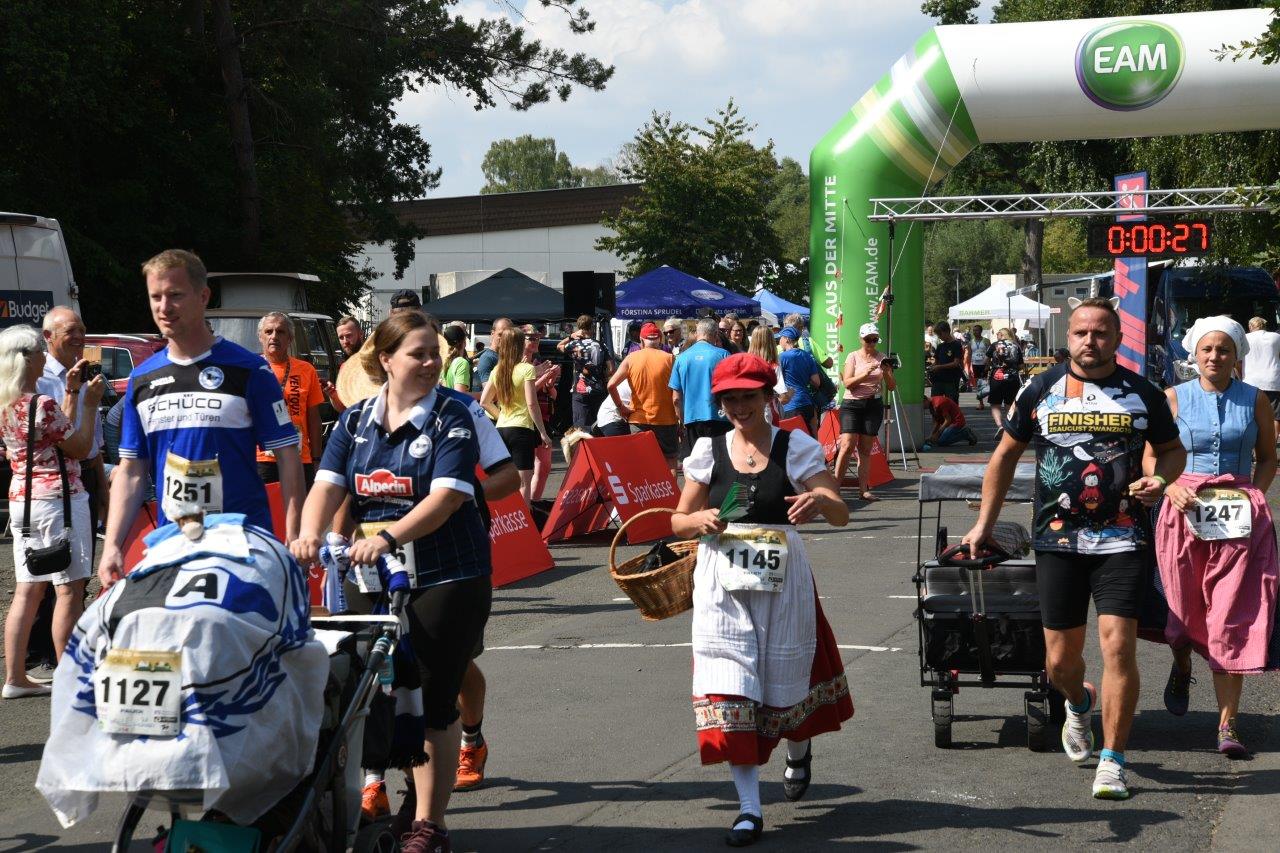 Was gibt es Schöneres, als in der Natur zu laufen und sie auch genießen, wenn man nicht immer mit Blick auf die Uhr auf Bestzeitenjagd ist. Beim Burgwald-Märchen-Marathon war jeder im Ziel Sieger und auch, wenn letztlich die Strecken etwas länger waren, so waren sie doch für alle gleich. So viele wie noch nie kamen in diesem Jahr nach Rauschenberg zum 1. Burgwald-Märchen-Marathon. Die Teilnehmerzahl hat sich mehr als verdoppelt. Seit der 750er Jahrfeier zählt Rauschenberg zum „WanderMärchenWeg“ und liegt an der Deutschen Märchen Straße. Daher lag es nahe, den 1. Burgwald-Märchen-Marathon ins Leben zu rufen. Dass die Resonanz dadurch aber so groß war und selbst Gruppen aus Bremen angereist waren, spricht für sich. Dazu gab es ein sehr schönes eigens dafür mit vielen bunten Märchenfiguren der Brüder Grimm bedrucktes schwarzes Finisher T-Shirt. Es hat sich herumgesprochen, dass die über 100 ehrenamtlichen Helfer vom LTD „Lauf deinen Traum“ Rauschenberg e.V. ein richtig schönes, wenn auch sehr anspruchsvolles Natur- Lauferlebnis anbieten. Aber die Stimmen im Ziel waren immer die gleichen: „Es war sehr schön im Burgwald, aber auch sehr anstrengend.“ Oder: „Die Strecke ist schon selektiv. der Anfang durch den Märchenwald mit der Treppe hat ja schon Cross Charakter, war aber durch die Figuren am Rande sehr abwechslungsreich. „Es war verdammt heiß zum Schluss, als es auf den letzten 10 Kilometern raus aus dem Mönchwald runter nach Wohra ging.“ Aber schweißtreibend war es auch für die Helferinnen und Helfer, die vom frühen Morgen bis zum Abend im Einsatz waren, und für den bekannten Laufmoderator Artur Schmid aus Herborn, der jeden einzelnen im Ziel mit seiner fachlichen Insiderinformation begrüßte und zusammen mit Cheforganisator Heinz Kaletsch auch zeitnah die Siegerehrung durchführte. Heinz Kaletsch konnte nach einem arbeitsreichen Tag eine positive Bilanz ziehen: „Wir haben nach nur sechs Jahren es geschafft, die 1000er Marke bei den Teilnehmern zu überschreiten und das trotz des zeitgleich in Wetzlar ausgetragenen Lahnparklaufs mit über 500 Teilnehmer. Erfreulich für 2020 am 30.08.2020 liegen für den 2. Burgwald-Märchenwald-Marathon bereits jetzt schon 160 Meldungen vor.