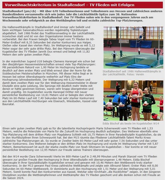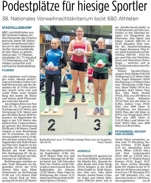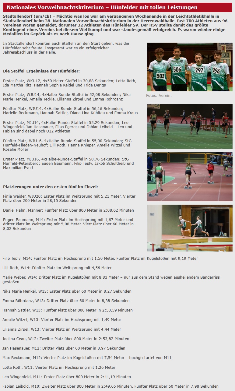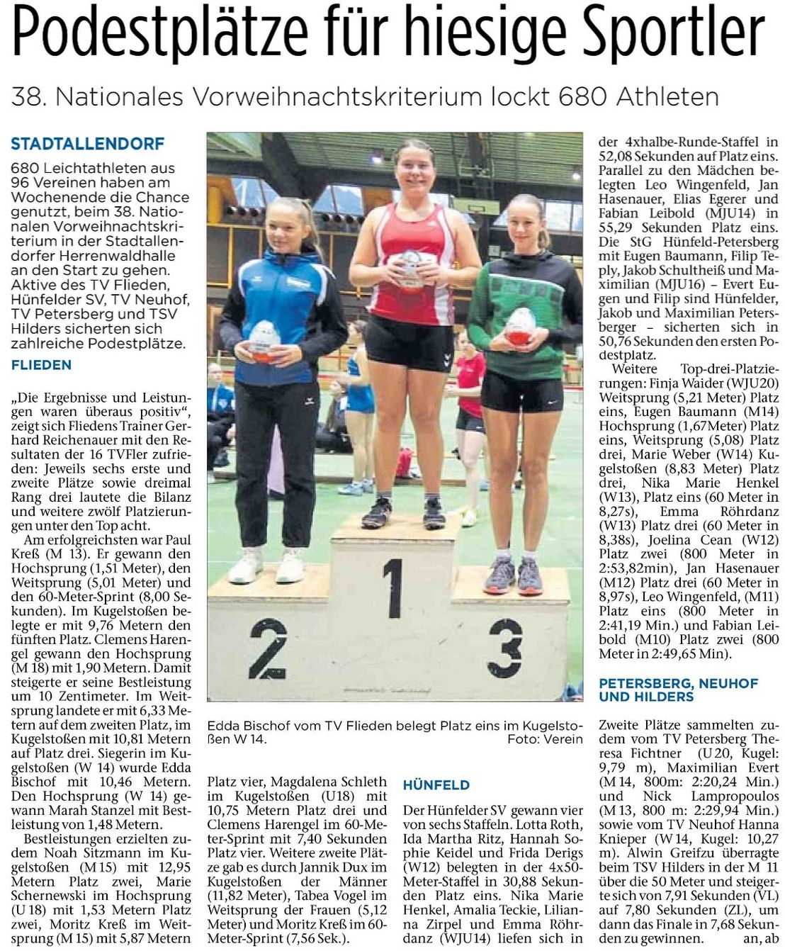 Mächtig was los war am vergangenen Wochenende in der Leichtathletikhalle in Stadtallendorf beim 38. Nationalen Vorweihnachtskriterium in der Herrenwaldhalle. Fast 700 Athleten aus 96 Vereinen waren gemeldet, darunter 64 Athleten aus dem HLV-Kreis Fulda-Hünfeld. Des Hünfelder SV. Der HSV stellte dabei das größte Kontingent eines Vereins bei diesem Wettkampf. Und wie schon in Frankfurt und Hanau gab es auch bei den Kampfrichtern Unterstützung aus Hünfeld. In Summe waren die Athleten des HLV-Kreises (TSV Hilders (2), TV Jahn Neuhof (5), TV Petersberg (9), TV Flieden (16), Hünfelder SV (32)) recht erfolgreich unterwegs.