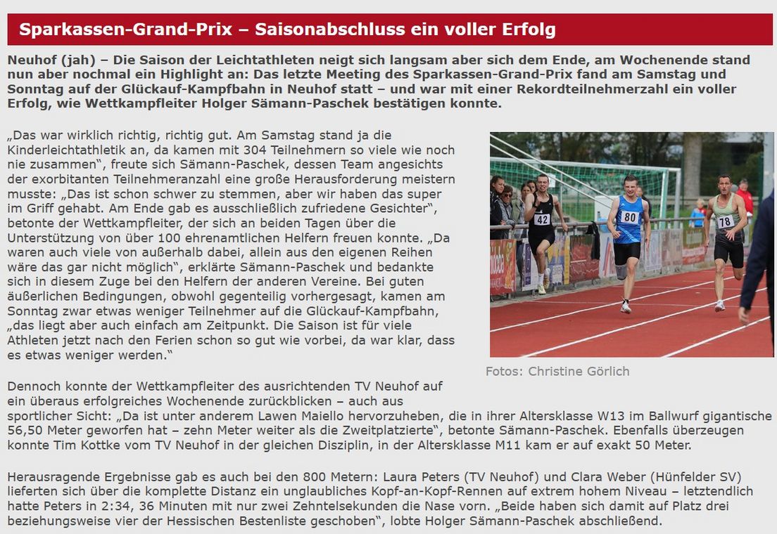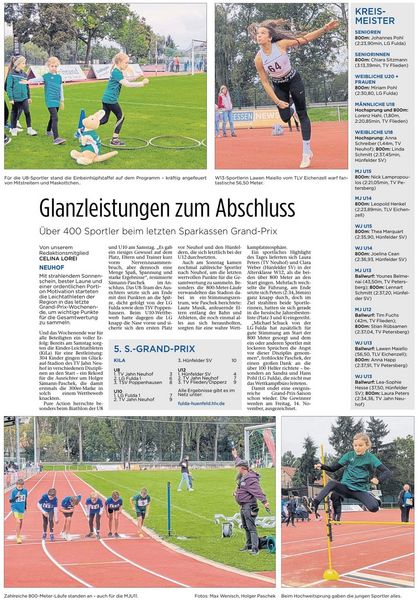 Im Neuhofer Glück-auf-Stadion in Neuhof fand am gestern und heute fünfte und damit auch letzte Sparkassen-Grand-Prix 2025 mit 421 Sportlern aus 21 Vereinen aller Altersklassen statt. Bei gutem leichtathletik-Wetter konnten die Sportler ihr Können unter Beweis stellen. Während der Samstag alleinig der Kinderleichtathletik vorbehalten war, stand dann der Sonntag voll im Zeichen klassischen Leichtathletik.