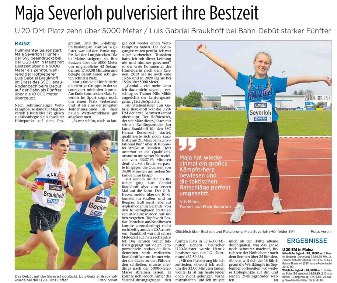 Deutschen Meisterschaften, Langstrecke; TOP-10-Platzierung und neue Bestzeit für Maja Severloh vom Hünfelder SV