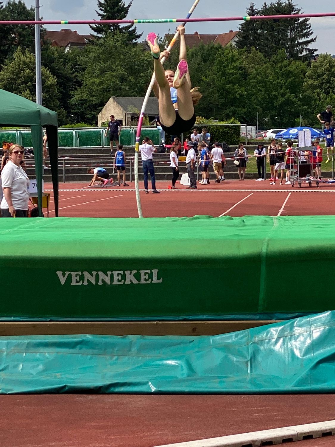 Im Burgfeldstadion in Friedberg war am Wochenende viel los. Über 600 Athletinnen und Athleten hatten gemeldet, um sich die Hessenmeistertitel in der U16 und U20 zu schnappen. Überragende Athletin des Wochenendes war Ella Schubert (W14) vom TV Windecken, die in insgesamt drei Disziplinen Gold gewann. In den 80m Hürden lief sie mit 12,36sek neue persönliche Bestleistung, gefolgt von 1,54m im Hochsprung und neuer PB von 5,16m im Weitsprung.