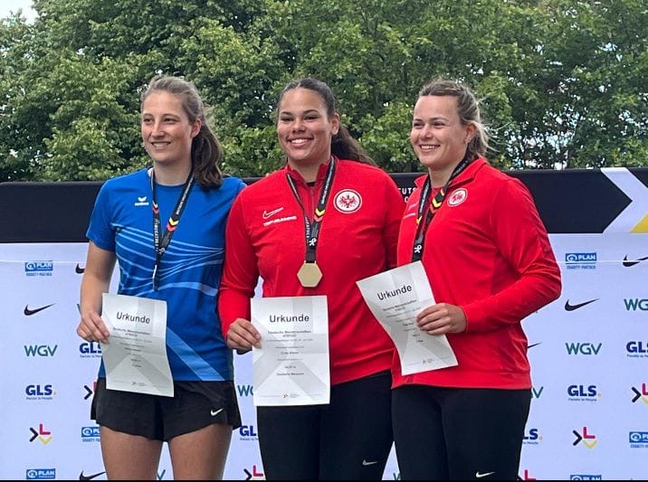 In Mönchengladbach zeigte der hessische Nachwuch in den Altersklassen U18/U23 auf nationaler Ebene ihr Können. Am Samstag waren es vor allem die Werferinnen und Werfer, die auf sich Aufmerksam machten. Max Bayer (Fränkisch-Crumbach) gewann den Hammerwurf der männlichen U18 mit starken 70,90m und darf mit der U18 EM in der Slowakei planen. Kai Hurych (66,89m, TSV Fürth) und Tim Steinfurth (LG Eppstein-Kelkheim) machten ebenfalls einen tollen Wettkampf und belegten in der U23 Hammerwurfkonkurrenz den 3. und 4. Platz. Sören Klose (Eintracht Frankfurt) wurde hier souverän Deutscher Meister. Larissa Rollberg (Eintracht Frankfurt) belegte mit neuer persönlicher Bestleistung von 59,45m im Hammerwruf der U23 Platz 6. Im Speerwurf überzeugten Lilly Urban (U23, 52,78m) mit dem Silberrrang und Maja Trittel (U18, 46,87m) mit Plart 5.