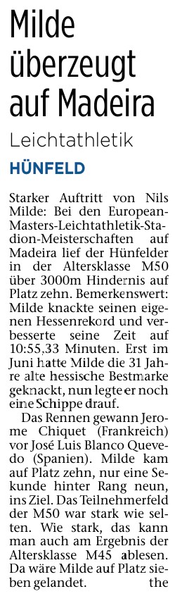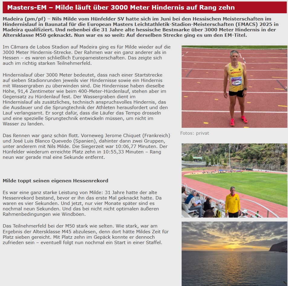 Am 07.06. dieses Jahres hatte sich Nils Milde vom Hünfelder SV bei den Hessischen Meisterschaften im Hindernislauf in Baunatal für die European Masters Leichtathletik-Stadion-Meisterschaften (EMACS) 2025 in Madeira qualifiziert. Und nebenbei die 31 Jahre alte hessische Bestmarke über 3.000 Meter Hindernis in der Altersklasse M50 geknackt.