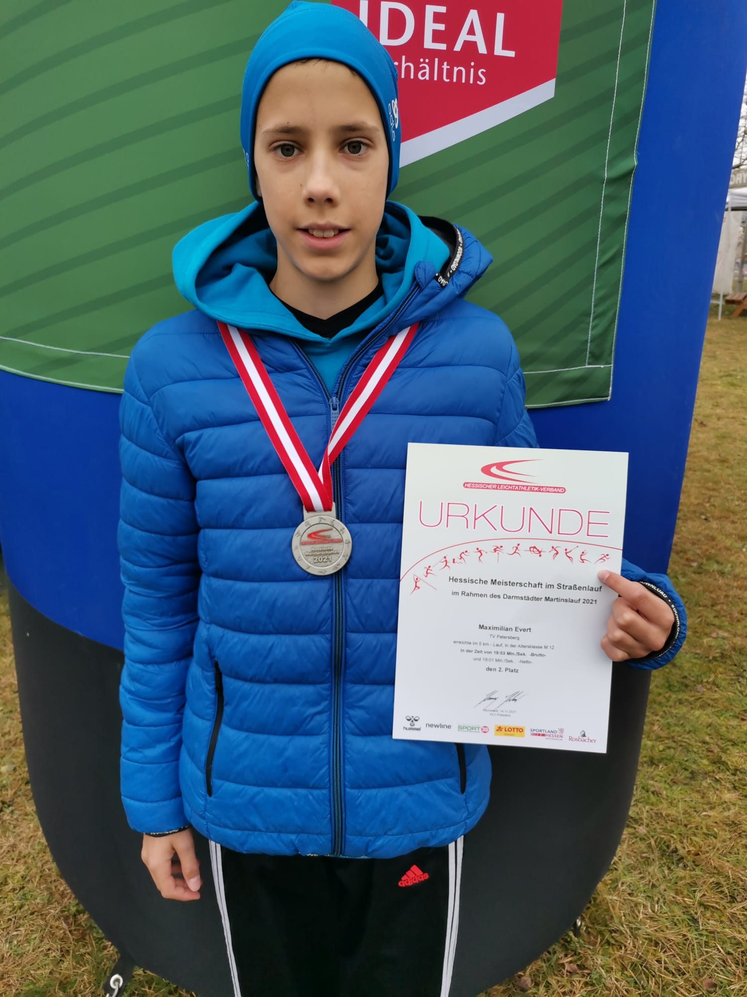 Maximilian Evert vom TV Petersberg wurde in der Altersklasse M12 Hessischer Vize-Meister über die 5 Kilometer-Distanz!