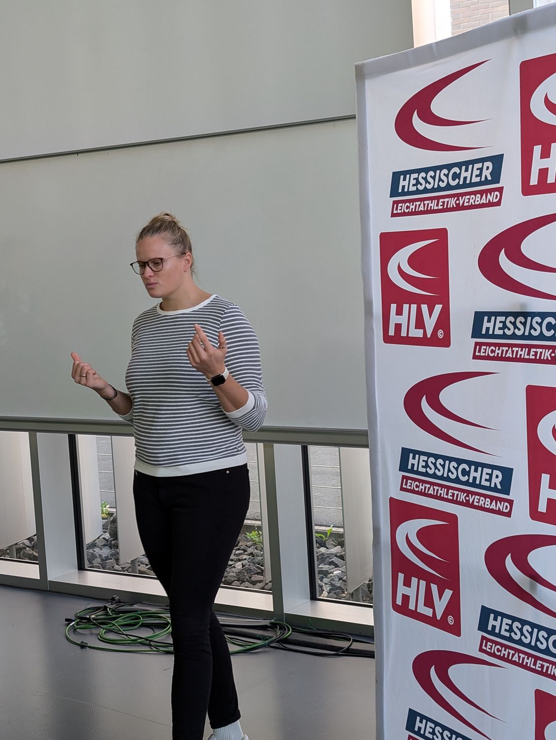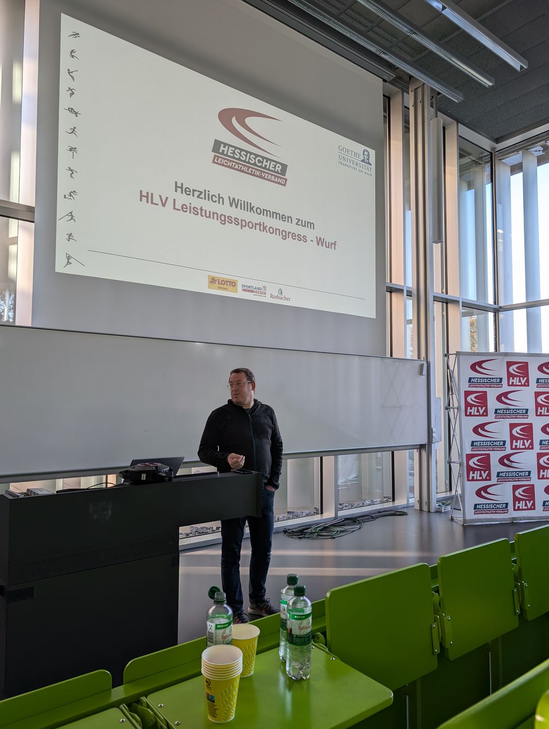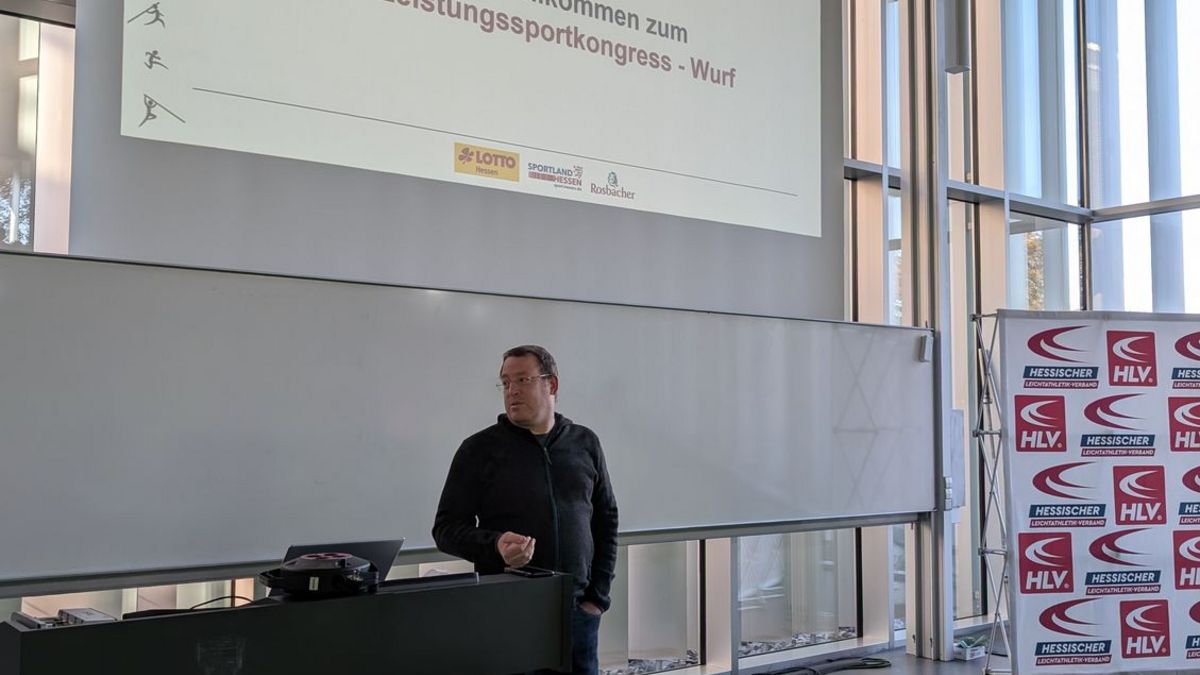 Mit dem erstmalig disziplinspezifischen HLV-Leistungssportkongress waren wir wieder im sportwissenschaftliichen Institut der Goethe-Universität Frankfurt zu Gast. Begrüßt wurden die rund wurfbegeisterten 130 Teilnehmer:innen vom Abteilungsleiter des sportwissenschaftlichen Instituts der Universität, Prof. Dr. Christopher Heim, HLV-Präsident Klaus Schuder, HLV-Vizepräsident Sportentwicklung Martin Rumpf, HLV-Geschäftsführer Sport Carsten Ebert und Manuel Odey, Fachwart Lehre im HLV und Fachleiter Leichtathletik bei der Goethe-Universität. Anschließend startete der erste spannende Vortrag des Tages von der ehemaligen Vize-Europameisterin und Olympionikin im Kugelstoßen Sara Gambetta. Sie schilderte ihren Weg von einer international erfolgreichen Mehrkämpferin in der Jugend zur ebenso erfolgreichen Kugelstoßerin im Erwachsenenalter. Vor allem wurden die frühe Spezialisierung in der Leichathletik und ihre Eindrücke als Leistungssportlerin thematisiert. Anschließend folgte ein spannnender Vortrag vom HLV-Landestrainer Wurf Martin Rumpf über Würfe im Kindesalter. Er wollte die Anwesenden dazu ermutigen, mit den Kindern und Jugendlichen rauszugehen und zu werfen. Seinen Vortrag beendete er mit dem Fazit: "Geht's raus und schmeißt's." Vor der Mittagspause hielt HLV-Cheftrainer Wurf, Bastian Otto, einen praxisorientierten Vortrag zu Hebetechniken im Krafttraining für Werfer:innen. Er ging auf verschiedene Kraftübungen ein, demonstrierte die korrekte Ausführung und gab wichtige Hinweise zu den verschiedenen Techniken. Nach der Mittagspause, die sehr intensiv zum Austausch untereinander genutzt wurde, folgte ein weiterer Vortrag vom Bundestrainer Diskuswurf, Markus Münch, zum Thema "Haben Zubringerleistungen aus dem Grundlagentraining eine Bedeutung? Erklärungen am Beispiel des weiblichen Diskuswurfs". Inhaltlich präsentierte er Studienergebnisse aus seiner Diplom-Trainerarbeit, welche den Einfluss von Zubringerleistungen auf die Wurfweite im Frauen-Diskus empirisch untersucht.