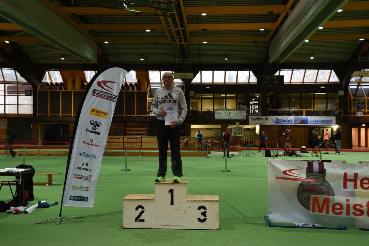 W70. Keine hat in den letzten drei Jahrzehnten bei Hessen- oder Deutschen Meisterschaft so viele Titel gesammelt wie die Anzefahrerin Helga Schüßler (TSV Kirchhain). Auf die Frage nach der Anzahl meinte sie, dass sie selber erst einmal nachsehen müsse. Mit den drei Titeln von Stadtallendorf sind es sage und schreibe 91 Titel. Bei ihrem Heimspiel in der Trainingshalle holte sie sich einen Doppelsieg im Sprint über 60m in 9,56 sec. und über 200 Meter in 33,06 seck. Als Zugabe gewann sie noch im Weitsprung mit 3,80 Metern. TSV Trainerin Jutta Eisenberg nahm selbst noch einmal in der W75 die 3 kg-Kugel in die Hand und stand mit Silber auf dem Podest. Alle Ergebnisse auf HLV oder DLV