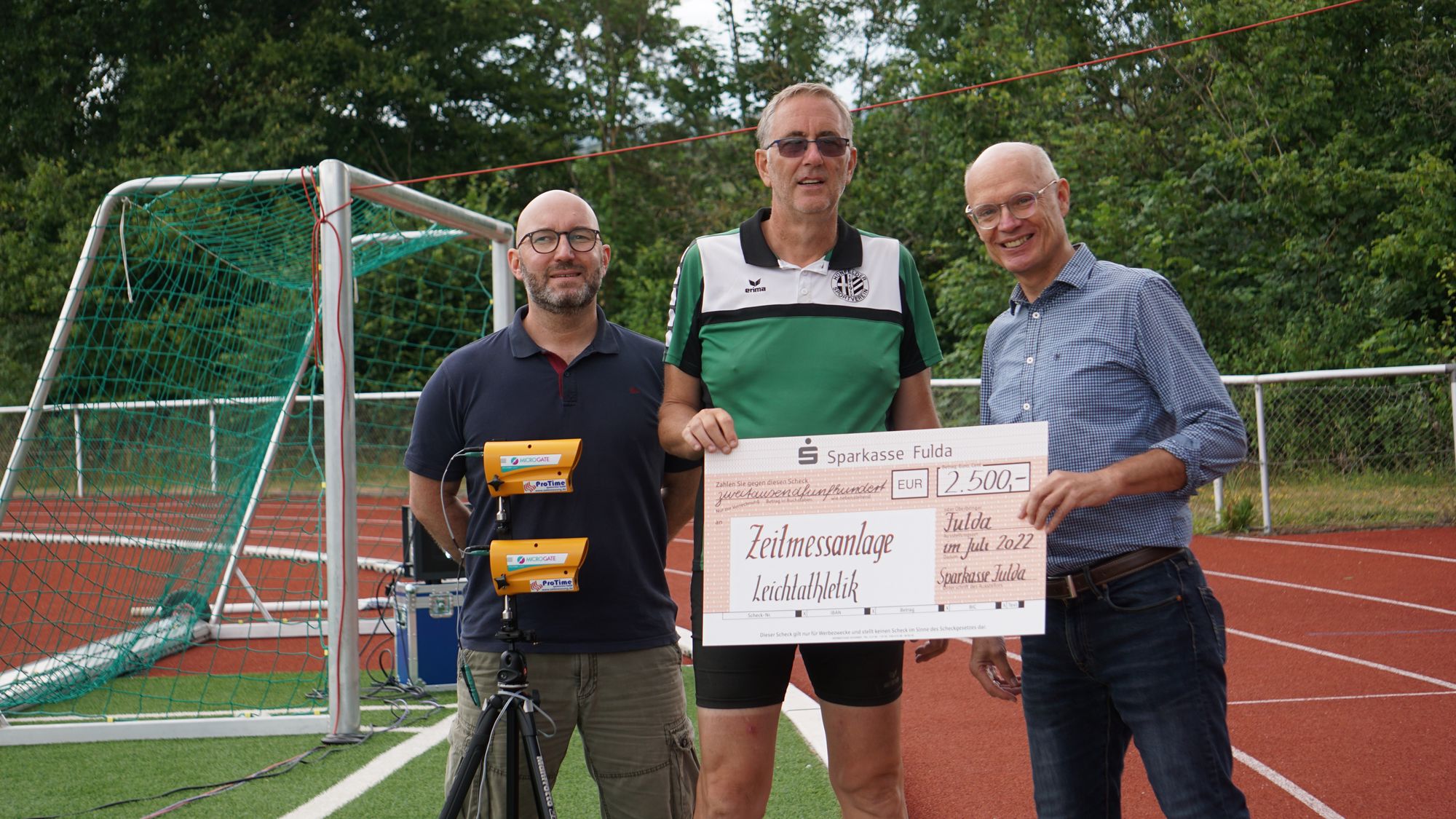 Die Zeitmessanlage des Hünfelder SV hat einen stolzen Preis; rd. 32.500 € mussten finanziert werden. Über Fördermittel, zahlreichen Spenden, der Teilnahme an Wettbewerben und Crowdfunding ist die Zeitmessanlage vollständig finanziert. Zwischen den Wettkämpfen wurde von der Sparkasse Fulda ein Scheck in Höhe von 2.500 € zur anteiligen Finanzierung der Zeitmessanlage überreicht!