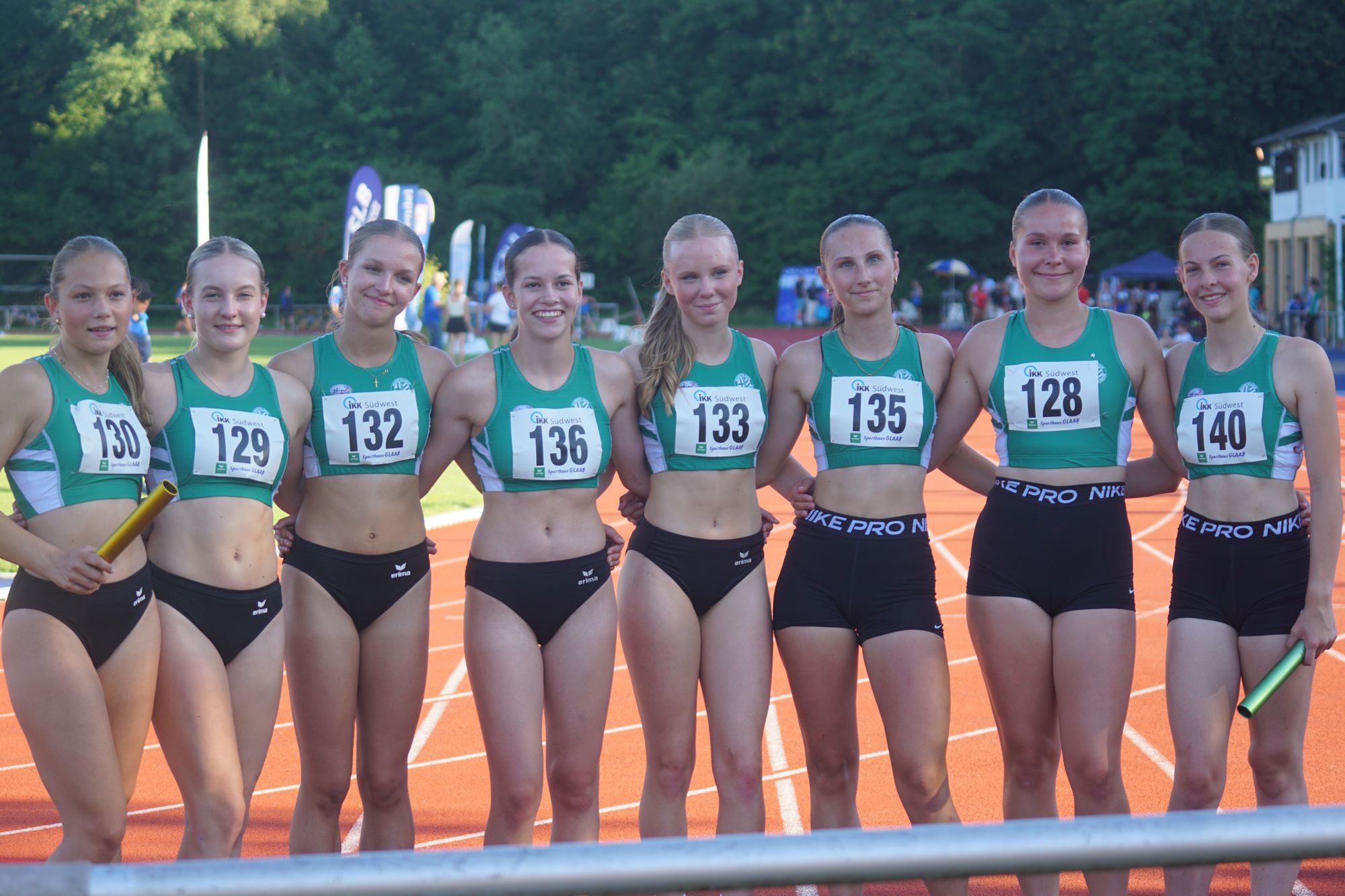 Zum Abschluss des Tages kommen die 4x100m-Staffeln dran. Letzte Woche haben unsere U16-Mädels hier GOLD geholt.