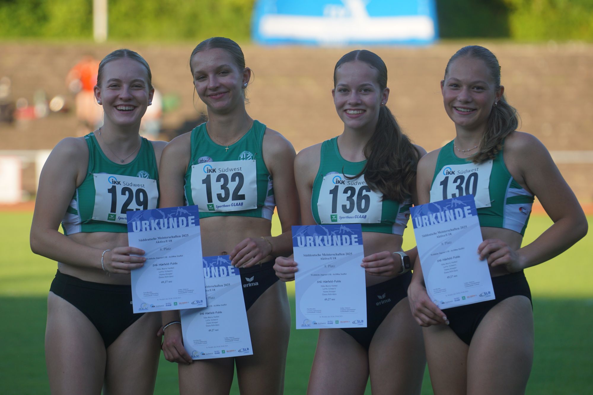 Gestartet wird unter der Startgemeinschaft Hünfeld-Fulda. In den Staffeln sind aber nur Mädels vom Hünfelder SV drin, die Fuldaer Mädels dürfen leider nicht. Die 1.Staffel in der Besetzung Nika Marie Henkel, Lotte Schwarz, Hanna Knieper und Emma Röhrdanz, die 2.Staffel in der Besetzung Lilli Roth, Edda Bischof, Svea Witzel, Lea-Sophie Schulz. Die 1.Staffel läuft in 49,27 Sekunden auf Platz 8, die 2.Staffel in 51,01 Sekunden auf Platz 18. Kein schlechtes Ergebnis; aber es geht schon noch besser!