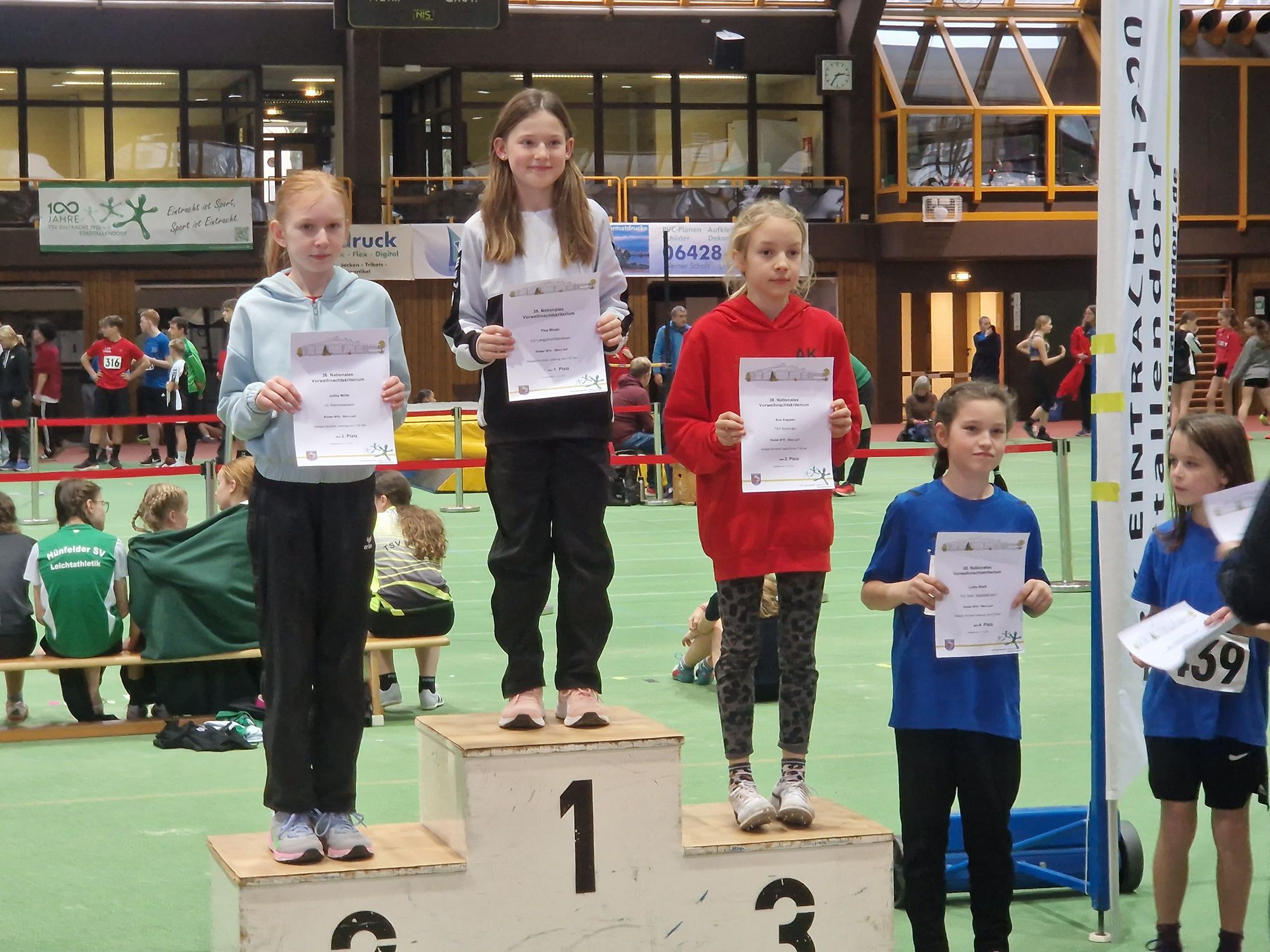 Bei den jüngsten Mädchen glänzte die Langgönserin Ylva Wedel auf der 50 Meter-Sprintstrecke. Sie steigerte sich von Vorlauf, über Zwischenlauf in den Endlauf kontinuierlich und siegte letztendlich mit 7,67s vor allen anderen. Zehn Meter länger durften Sophia Rieß und Celina Glienke (beide LGLO) sowie vom TVW Sophilia Schreier, Sophia Sand und Sarah Schick sprinten. Rieß, Glienke und Schick erreichten in der W13 locker die Zwischenläufe, die Endläufe erreichte dann aber nur Sophia Rieß. Im anschließenden B-Finale wurde sie mit 8,77s Vierte. Sophilia Schreier lief bei den Mädchen W12 im Zwischenlauf 9,01s, knapp mehr als noch im Vorlauf. Sarah Schick trat jedoch nicht nur auf der Sprintstrecke an, in ihrer eigentlichen Lieblingsdisziplin Hochsprung lief es mitunter fabelhaft. Die Höhen bis 1,40m übersprang sie jeweils im ersten Versuch. Auch die 1,46m klappten dann wieder im ersten Versuch. Die anschließende Höhe von 1,49m nahm Schick dann im zweiten Versuch, stelle hiermit ihre bisherige Bestleistung ein. Der erste Versuch über die nächsthöhere Höhe von 1,52m riss dann knapp. Nichts desto trotz sicherte sie sich damit den Silberrang.